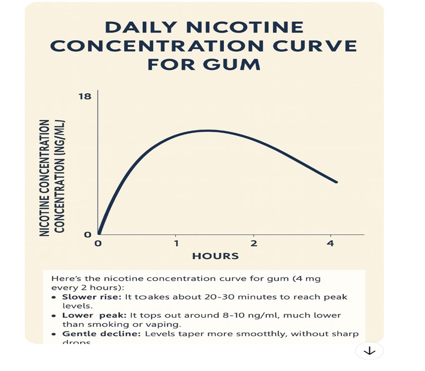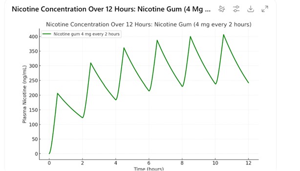 Here’s the nicotine concentration curve for gum (4 mg every 2 hours):
